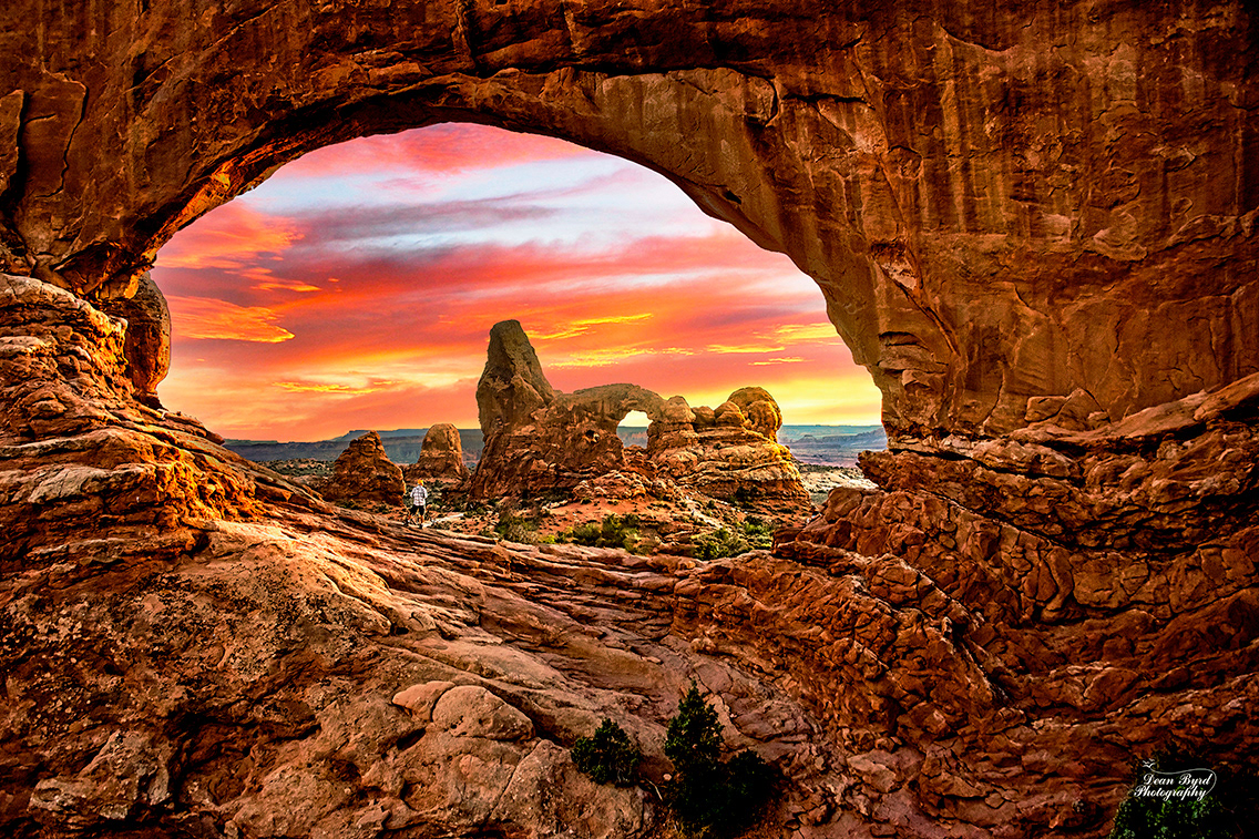 Beneath the towering span of the North Window Arch in Arches National Park, a lone figure pauses to take in the glow of sunset. The immense scale of the arch, carved by millennia of wind and weather, makes the man appear almost weightless against its grandeur. As the last light of day ignites the sandstone in shades of gold and crimson, the scene becomes both humbling and uplifting—a reminder of the vastness of nature and our small but meaningful place within it.