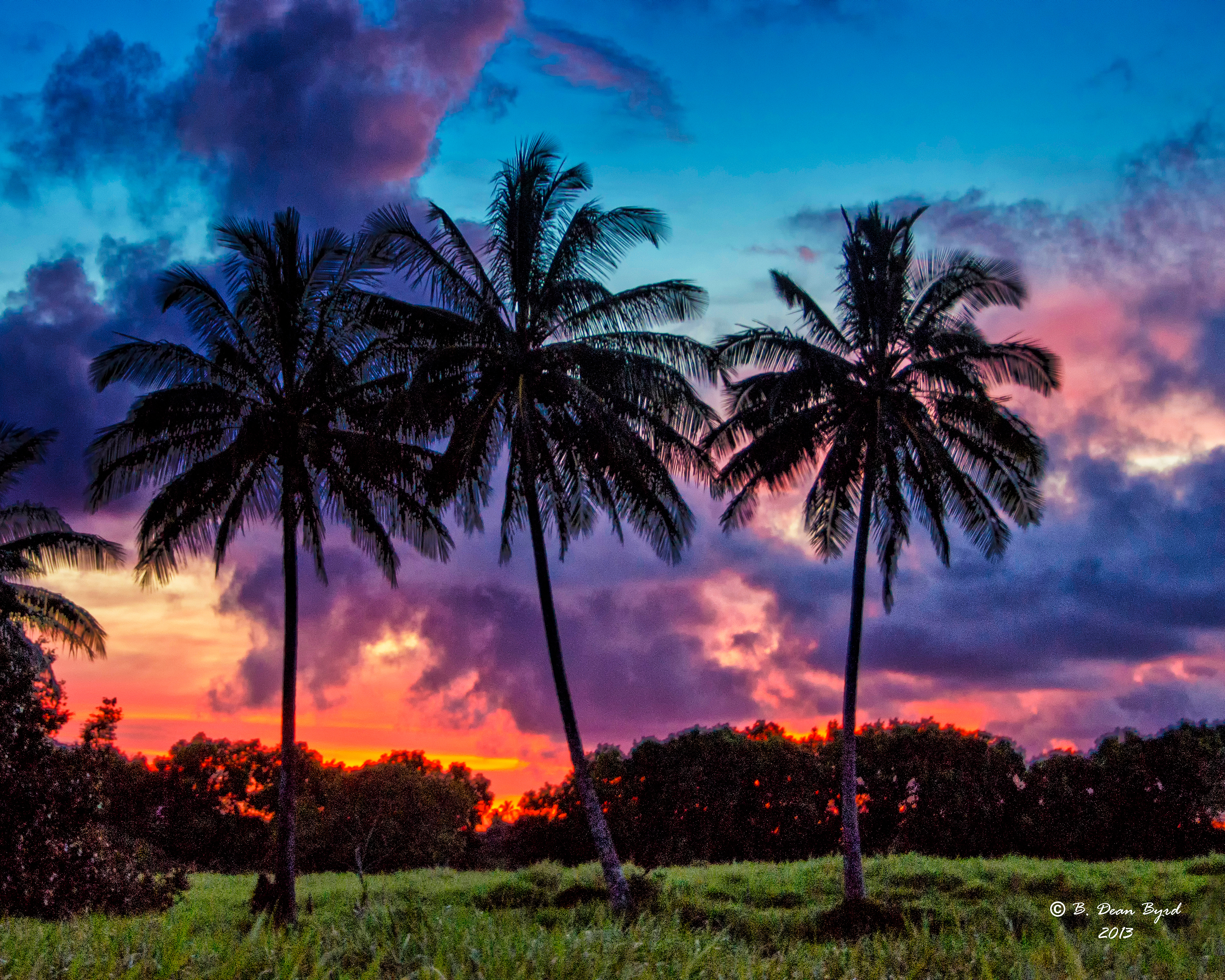 My wife Leona and I were enjoying our last night on the Island of Kauai watching the sunset over Hanalei Bay. As the sunset seemed to wane, I broke a photographers cardinal rule. I left too soon. As we were on our way back to our room a most spectacular sunset began to appear. I was able to capture it among these palm trees.