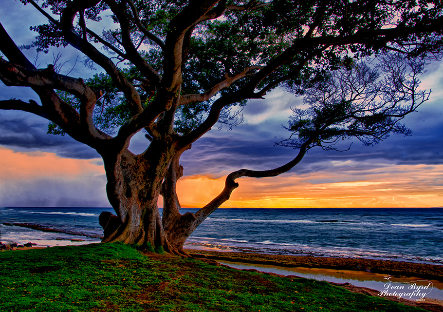 A short time before sunset a squall moved through the area on Maui. The clouds obscured the island of Molokai, but generated some great color. This magnificent old tree along the beach provides a great foreground for the scene.