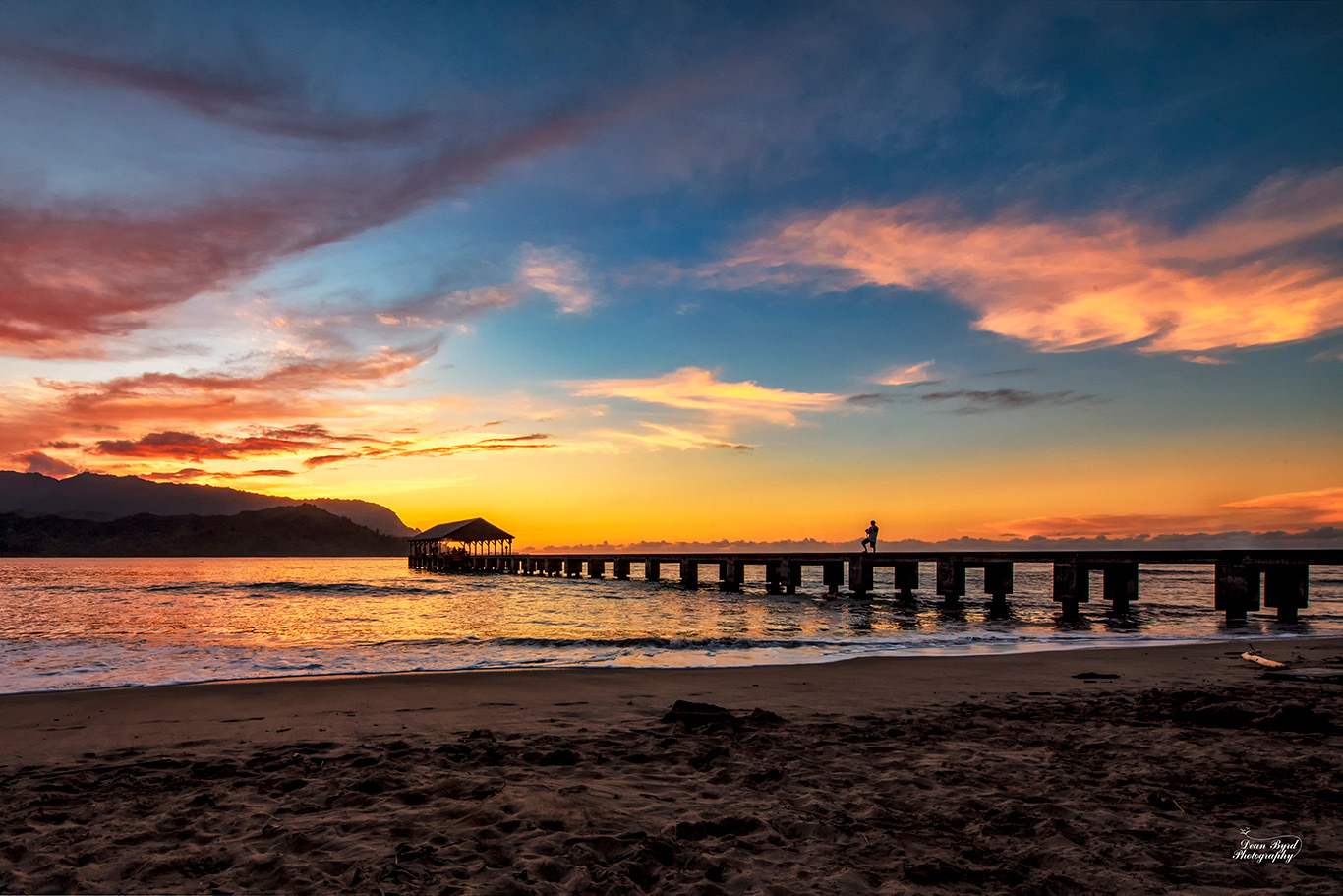 Hanalei Bay located on the Hawaiian Island of Kauai is a gathering spot for locals as well as tourists. Every evening crowds gather on the beach and on the pier to watch the sunset. Seldom is anyone disappointed.