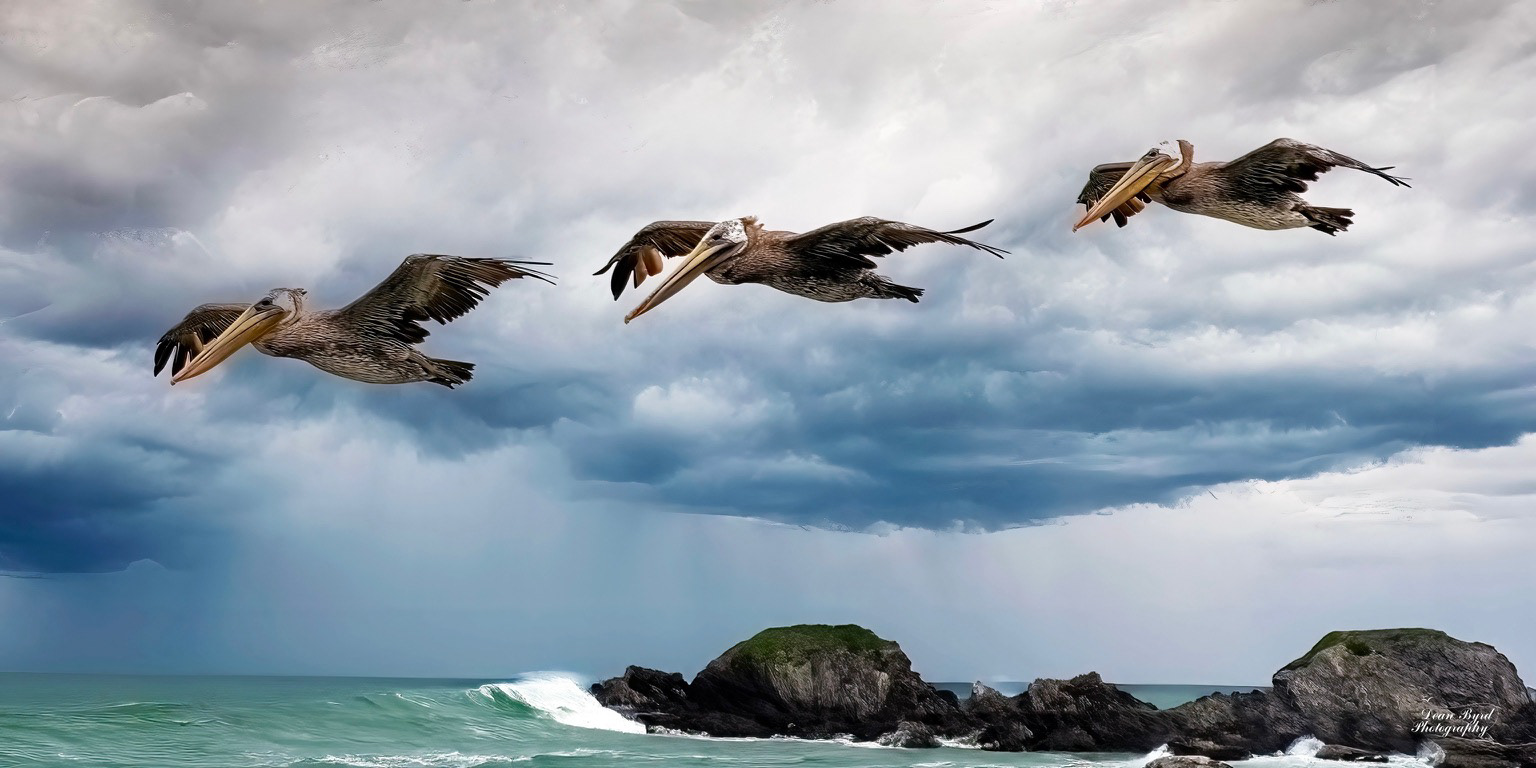 Above the windswept coast near Copalis Beach, Washington, three pelicans glide gracefully in perfect formation. Their wings cut silently through the air, a striking contrast against the soft, clouded sky. In this fleeting moment, the elegance of nature’s rhythm is revealed—majestic birds carried effortlessly on the coastal breeze, embodying both strength and serenity.