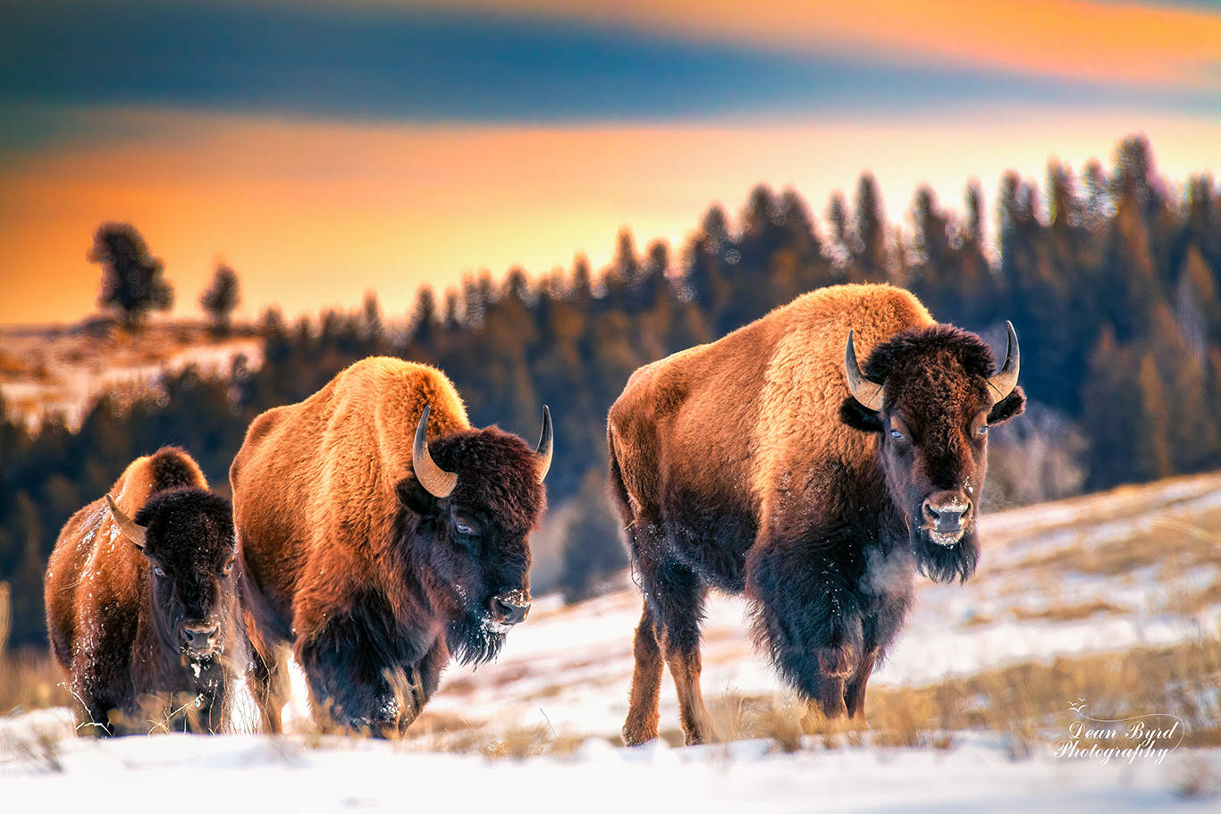 Bull Bison tend to hang out with other Bulls or alone during the non mating season. These three magnificent animals were observed in the Lamar Valley, Yellowstone National Park.