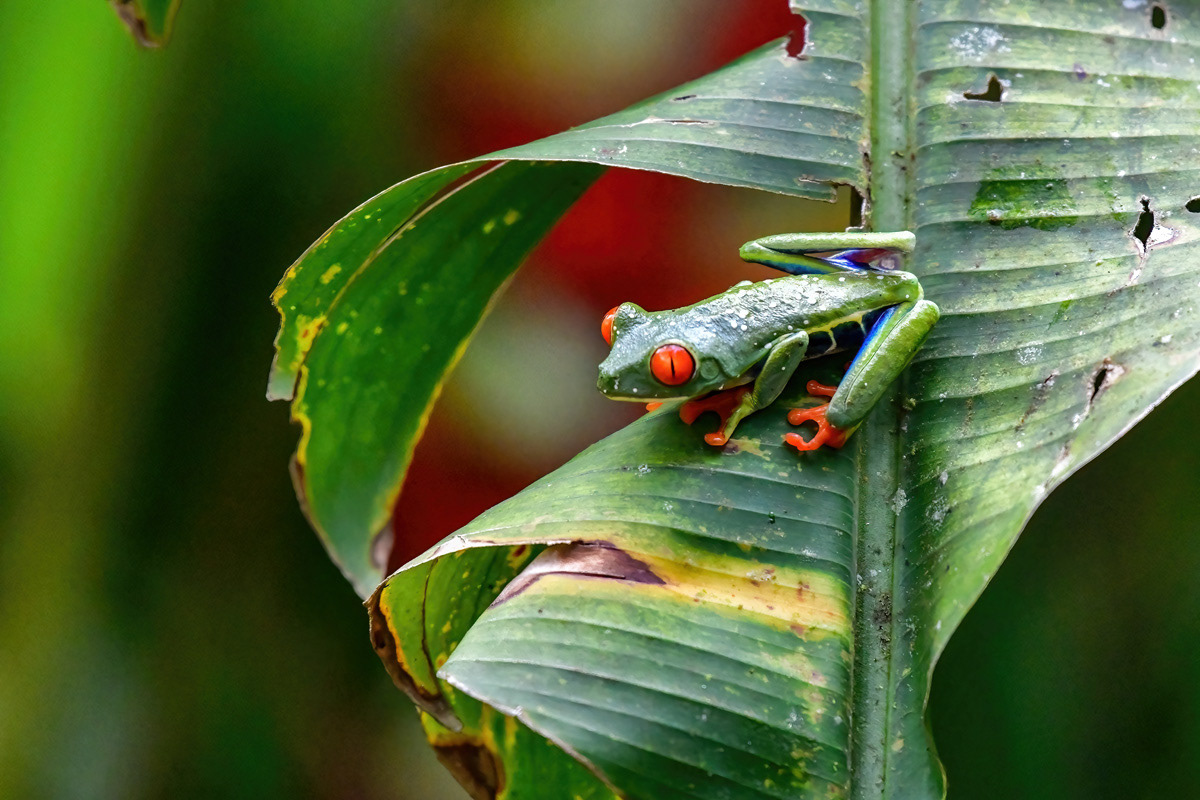 This red eyed tree frog is just one of many varieties of frog found in Costa Rica. Unlike several of its relatives, this frog is not poisonous.